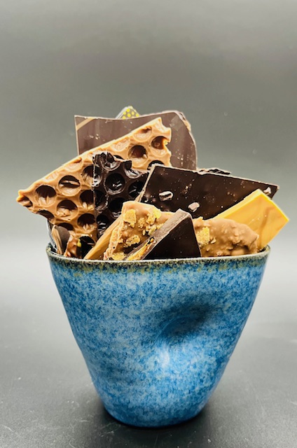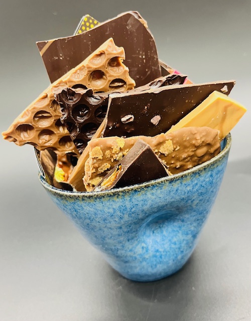 Assortiment d'éclats de chocolat 100 g diverses saveurs et gourmandises - produit signature réputé chez notre partenaire Maître Chocolatier Gourmandises, accompagné de sa tasse, pièce unique et locale (Création de la tasse par Béatrice Allard, Artiste Céramiste, son atelier se trouve à Dommartin-Lès-Toul).